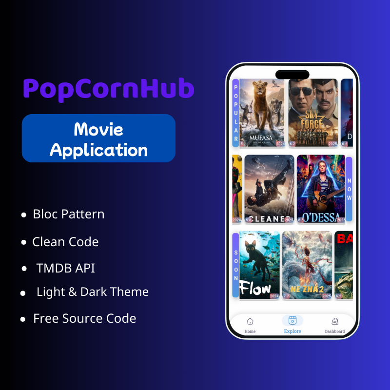 PopcornHub a movie app where you can watch the newest trailers, explore trending movies, and discover actors & animations. Stay updated with the latest films and get a sneak peek before they hit theaters!
